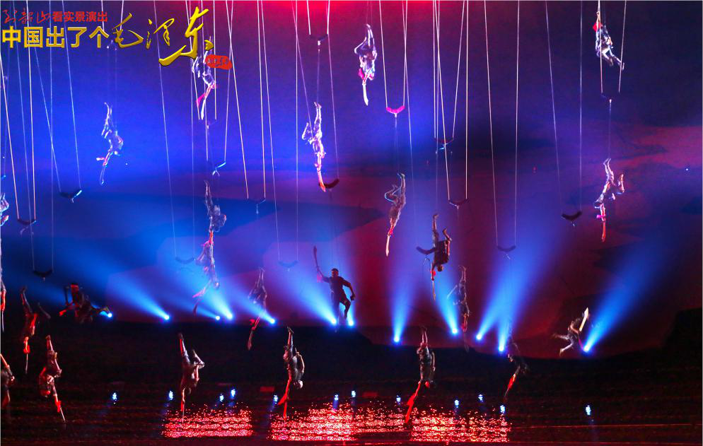威亚:韶山实景演出还有着震撼的舞台机械调度装置和高难度的集体威亚表演,十七勇士飞夺泸定桥的集体威亚表演壮丽而刺激,在观众头顶上方呈现,让观众身临其境。